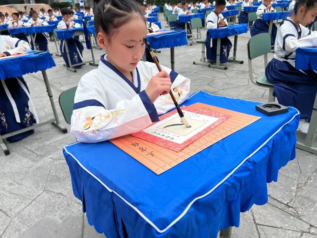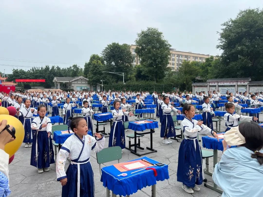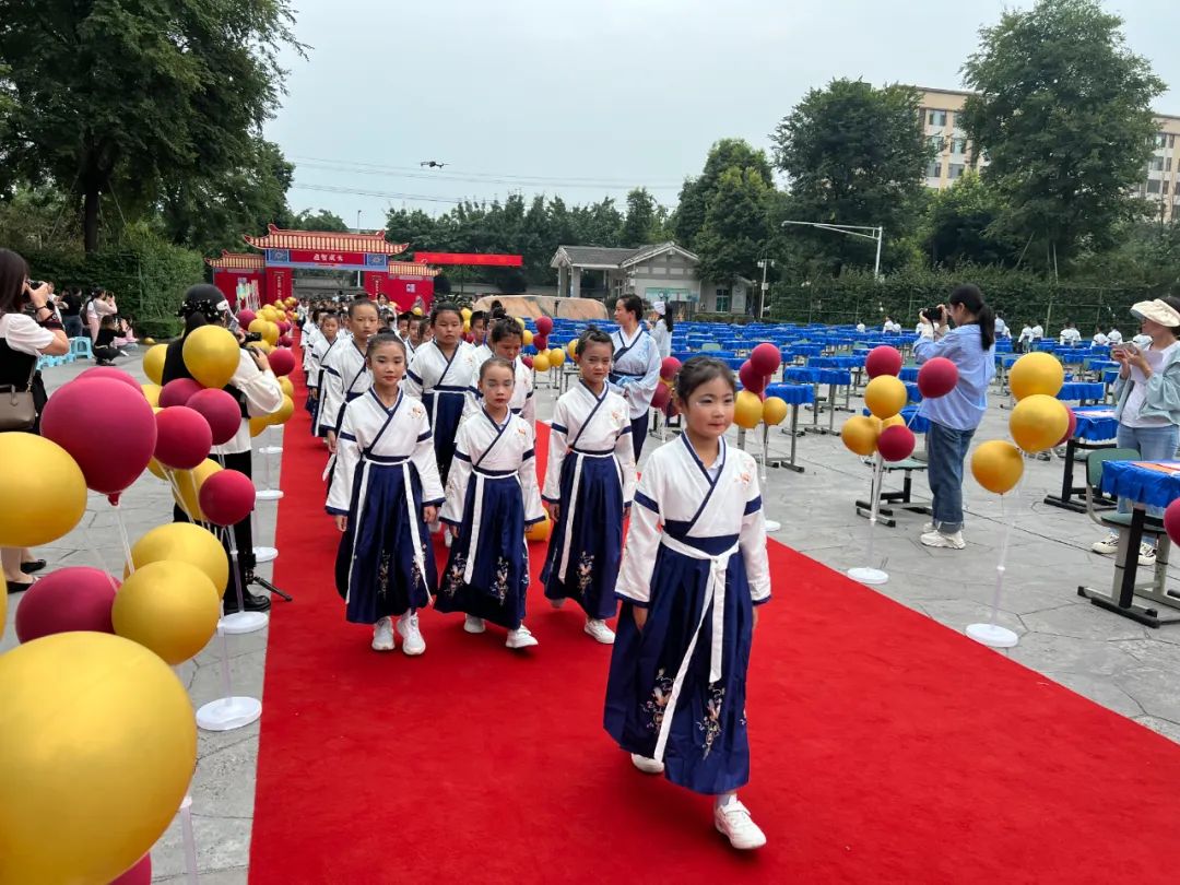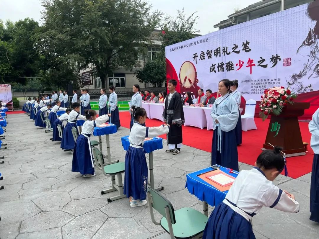 2023年9月27日,由中共大邑县委宣传部、大邑县精神文明建设办公室、大邑县教育局、大邑县关心下一代工作委员会主办,大邑县沙渠学校承办的“开启智明礼之笔 成儒雅少年之梦”大邑县城乡精神文明建设系列活动在沙渠学校隆重举行。百余名三年级学子在古韵声中领略古礼魅力,弘扬优秀礼乐文化,传承孝亲尊师美德,为一生一次的启智成长礼增添了满满的仪式感。