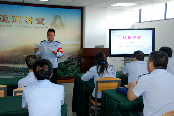 为积极培育和践行社会主义核心价值观,不断提高干部职工道德水平和社会文明程度,扎实推进“两学一做”学习教育,2016年9月20日上午,大邑地税局结合第十四个全国“公民道德宣传日”,组织开展了“公民道德宣传日”主题道德讲堂展演活动,深入、全面学习了《成都市民文明公约》。